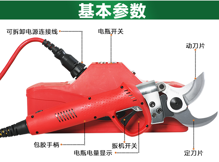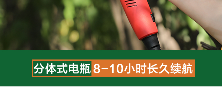 产品特点:电瓶采用便携背包设计和电瓶电量显示设计,工作轻松方便,实用于45MM的硬树枝剪切,代替传统手工剪,减轻劳动力和劳动成本。